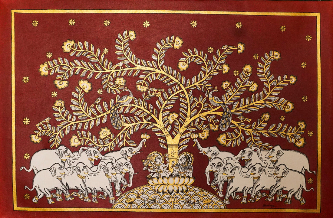 This exquisite traditional Indian painting depicts a majestic horse adorned with intricate mythological and cultural...
