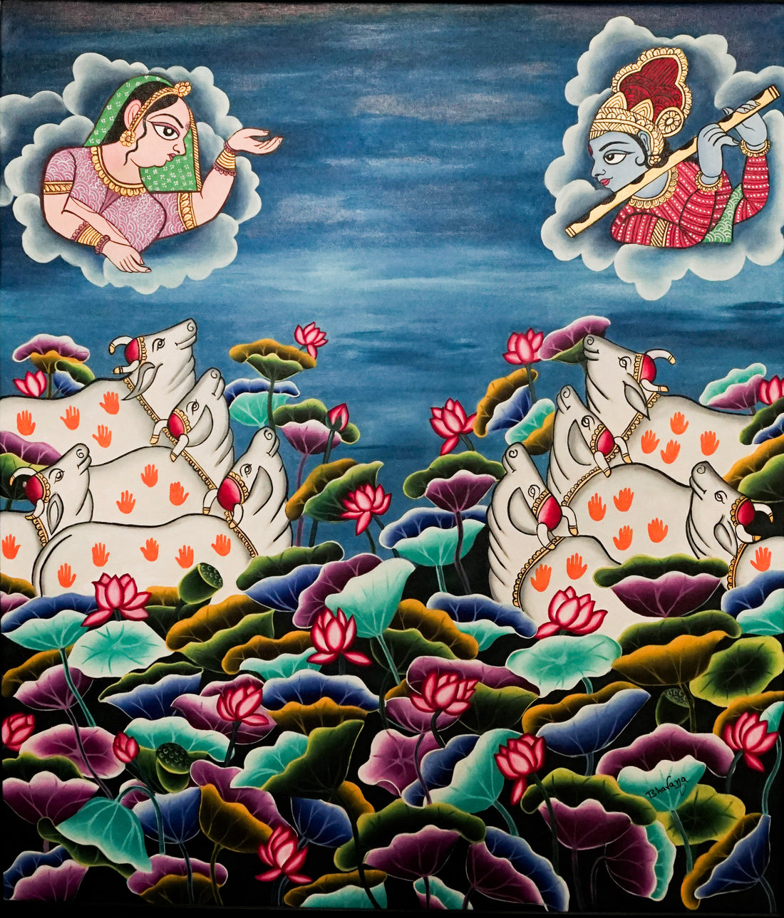 This stunning traditional folk painting portrays Lord Krishna with Radha, surrounded by cows under lush...