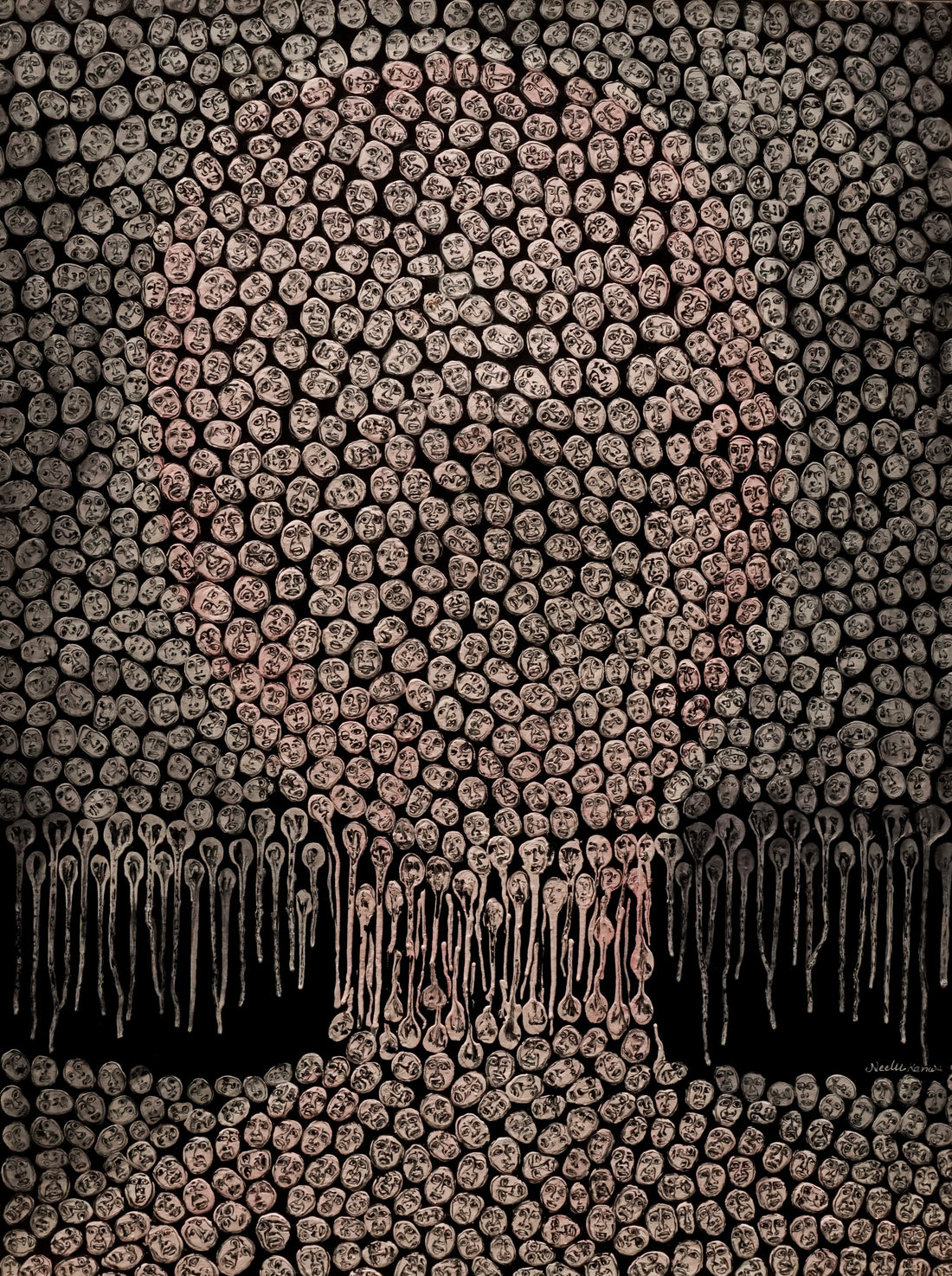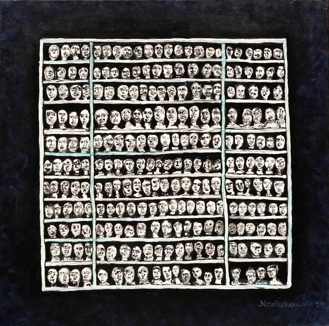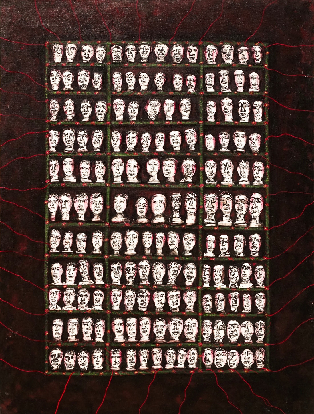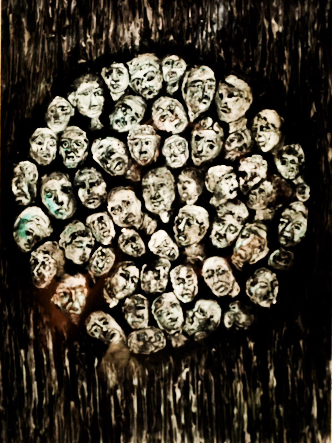 This thought-provoking painting captures a dense cluster of human faces, each etched with raw expressions...