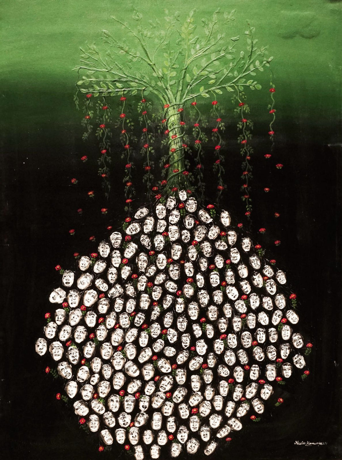 A poetic interplay of life and identity, this painting shows a flourishing tree whose roots...