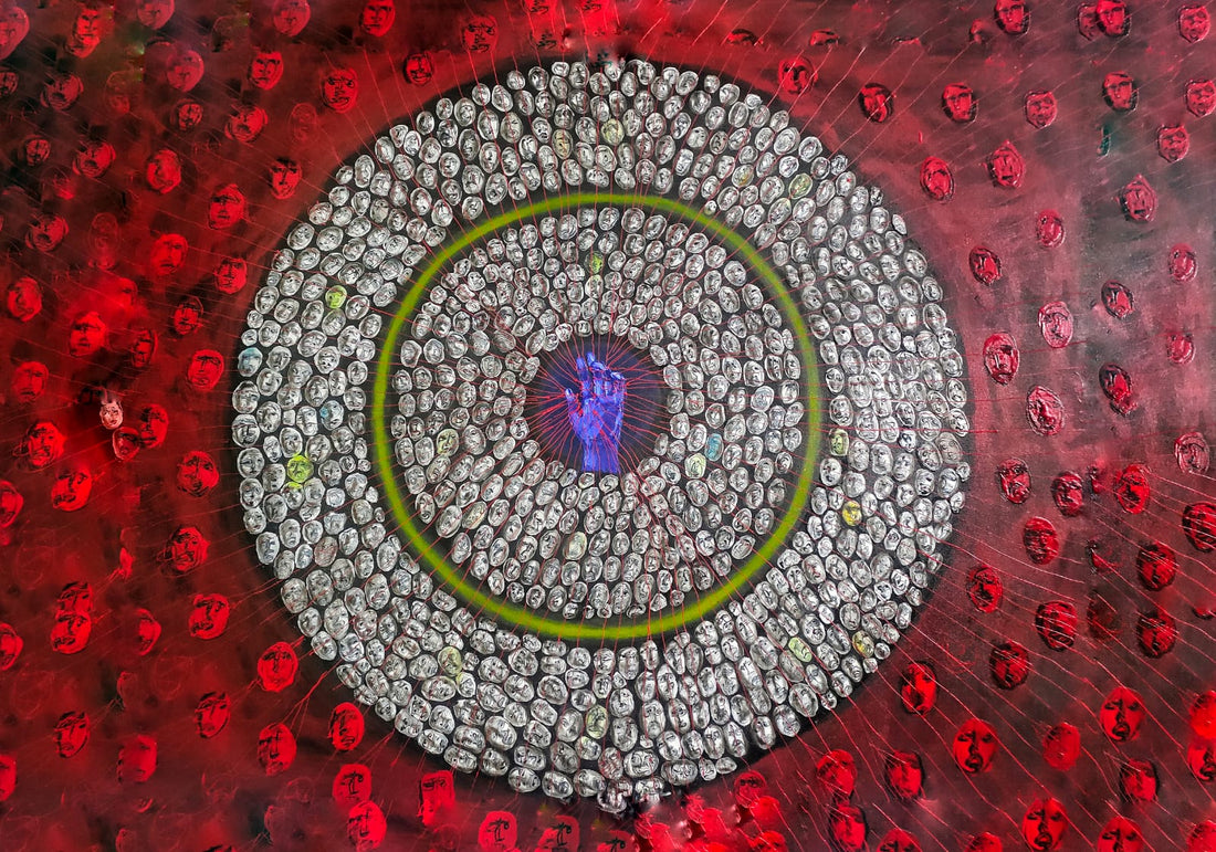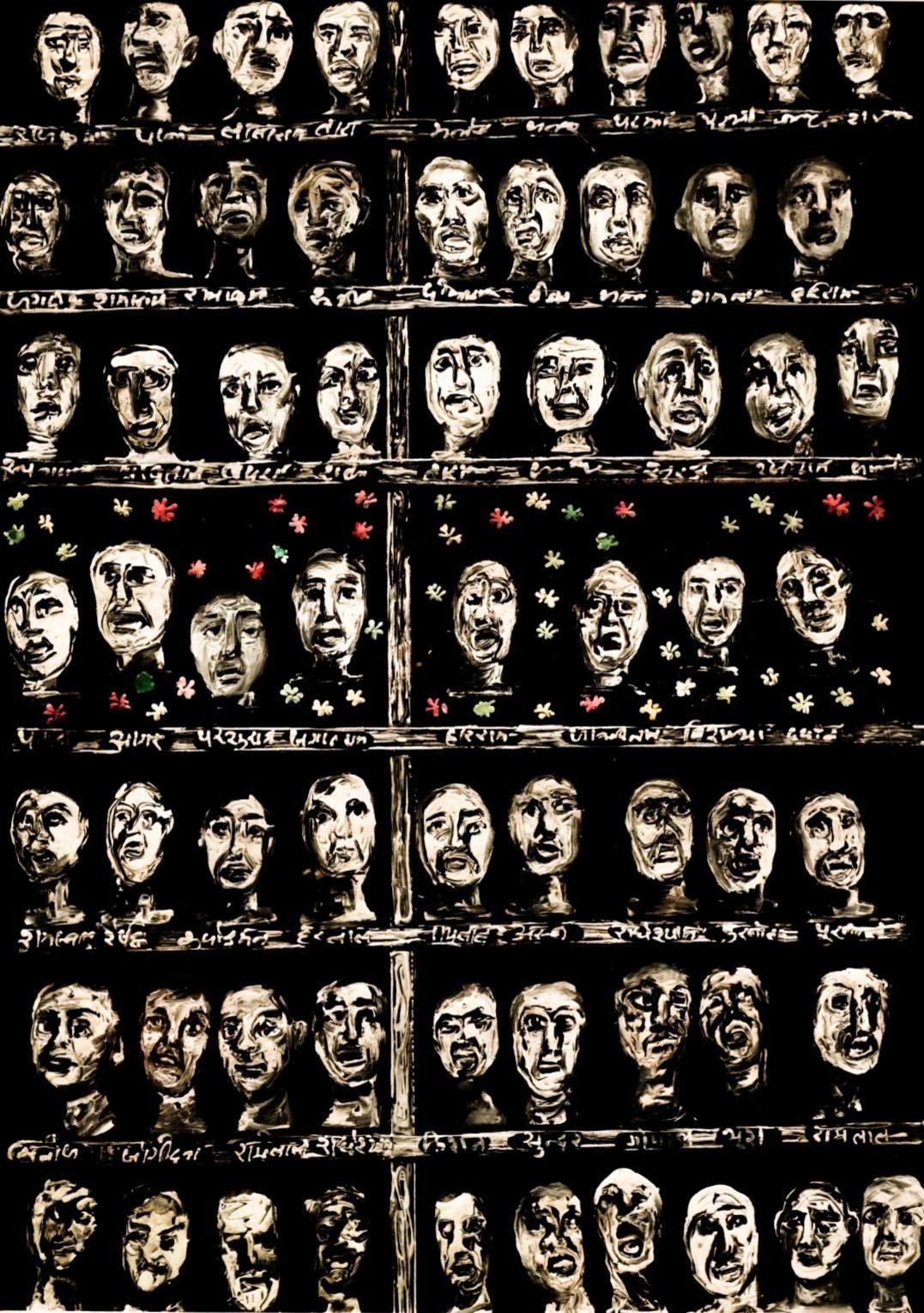 This captivating acrylic painting, titled "My Portrait," presents a striking grid of numerous stylized faces,...