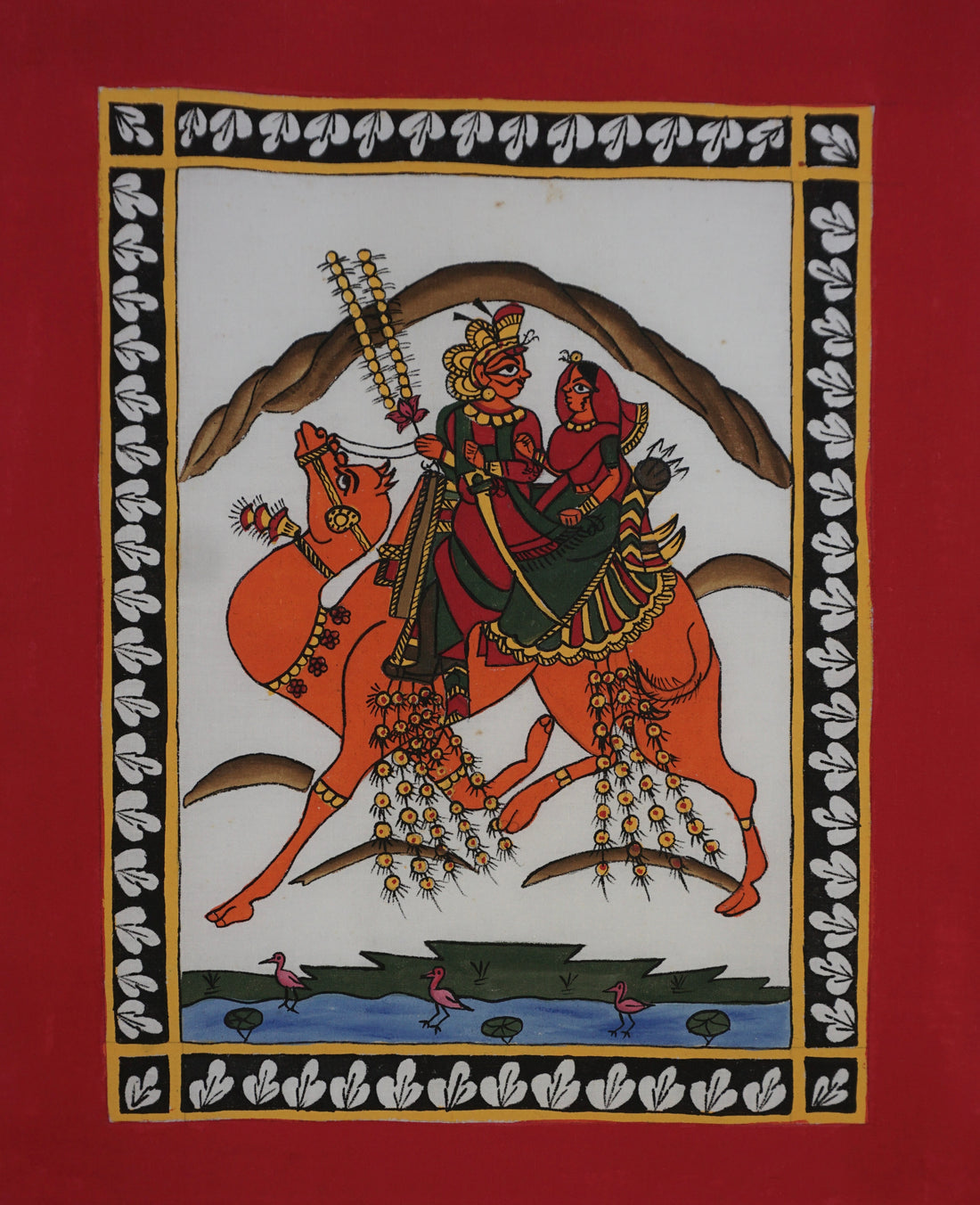 This exquisite traditional Indian painting depicts a majestic horse adorned with intricate mythological and cultural...