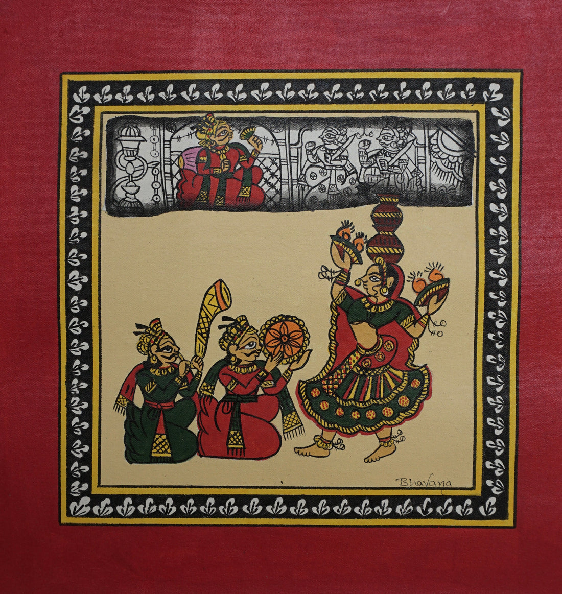 This vibrant painting beautifully captures a moment of cultural festivity in traditional Indian folk style....