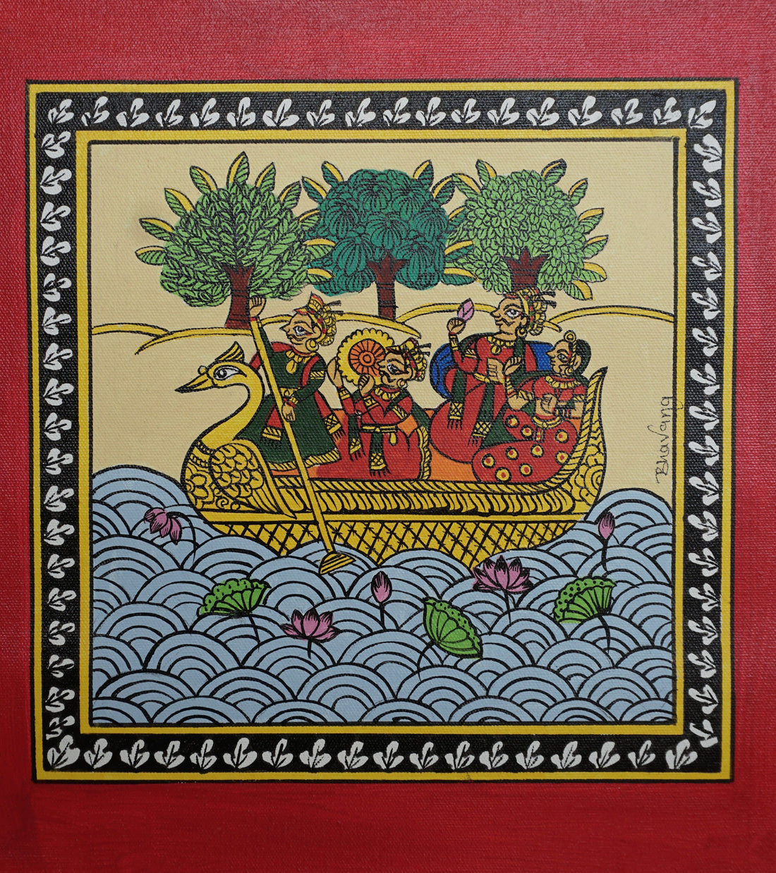 This exquisite folk painting portrays a serene and symbolic boat journey on a lotus-filled river,...
