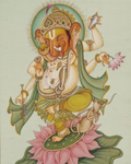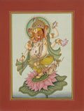 This vibrant miniature painting, in a calendar-style presentation, depicts a dancing Lord Ganesha. He is shown with his characteristic elephant head, multiple arms holding various attributes including a conch shell and a lotus, and his vahana (mount), the mouse, is seen at his feet. Ganesha stands dynamically on a blossoming lotus, surrounded by a subtle halo, all rendered with traditional Indian miniature painting techniques. The artwork is framed by a bold red border.
