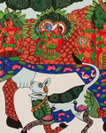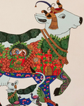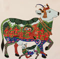 This exquisite artwork celebrates Kamadhenu, the sacred wish-fulfilling cow in Hindu mythology, revered as the mother of all prosperity. Adorned with intricate miniature-style detailing, the painting portrays divine deities and cosmic energies residing within her body, symbolizing abundance, nurturing, and spiritual power. The vibrant use of reds, greens, and blues brings the composition to life, while motifs of peacocks and lotuses add grace and auspiciousness. A timeless piece of Indian folk tradition, it reflects devotion, culture, and the eternal connection between the divine and nature