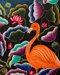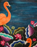 A harmonious celebration of nature and color, this painting features two flamingos surrounded by an enchanting garden of blooming lotuses and large, undulating leaves. The composition is alive with contrast—deep blues and purples blend seamlessly with bright greens and warm yellows. The flamingos’ curved forms echo the natural flow of the foliage, creating a balanced and dynamic visual rhythm. With its intricate detailing and expressive style, this piece brings vibrancy and a sense of calm to any setting.