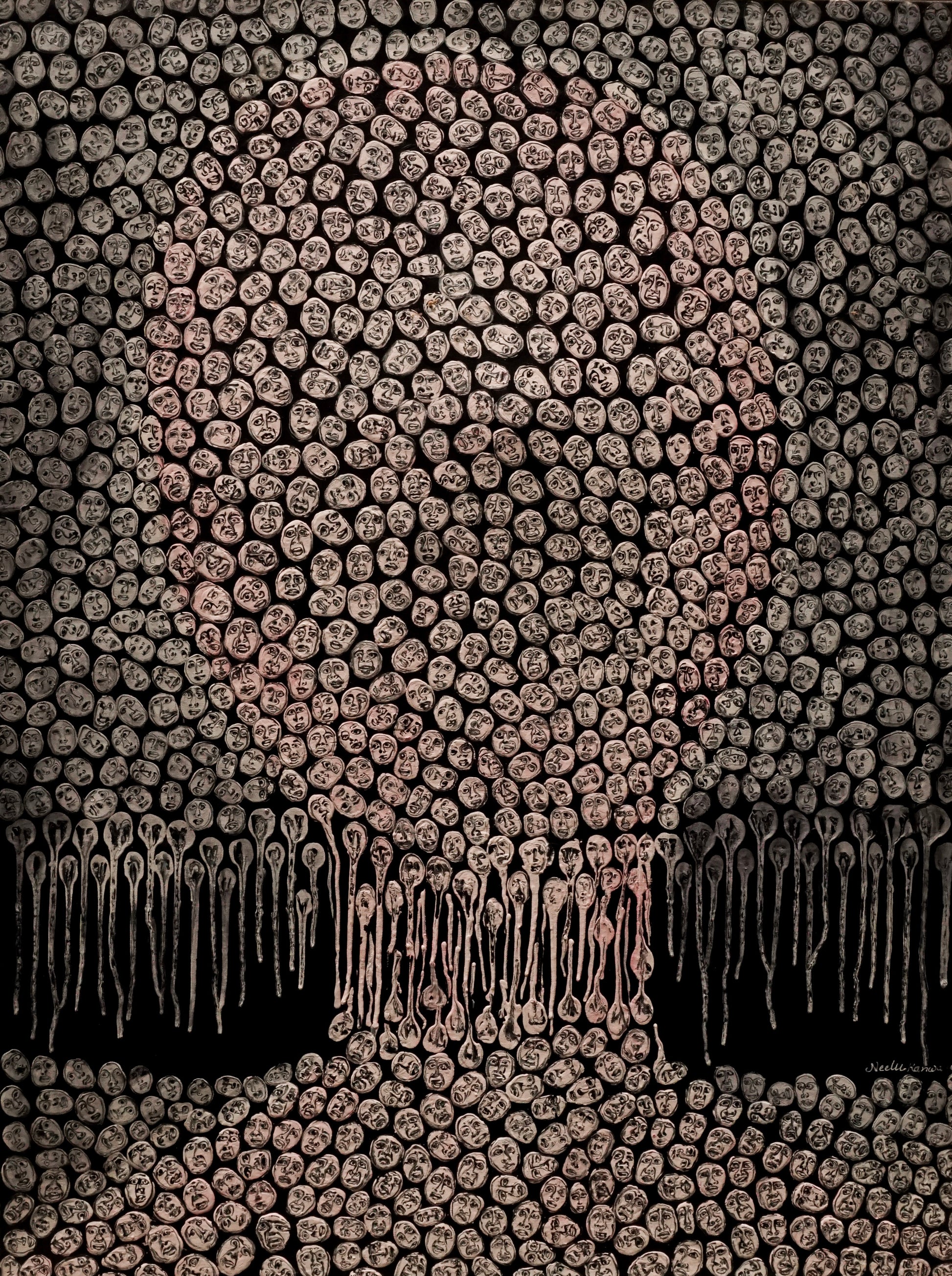 A haunting mosaic of faces forms the outline of a single human figure—blurred between individuality and collectivity. “I or We” challenges the viewer to reflect on the boundaries between self and society. Dripping textures below hint at shared emotion, identity, or loss, creating a powerful visual dialogue on unity and dissolution.