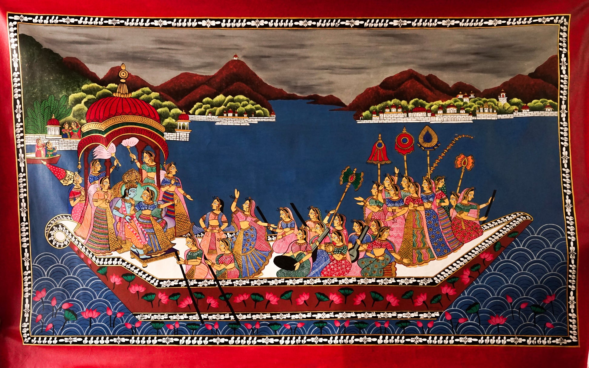"Nauka Vihar" literally means "boat ride" or "boating excursion". The painting clearly shows Krishna and his companions enjoying a boat ride, which is a classic episode in Krishna Leela, especially popular in paintings from Rajasthan and other regions.