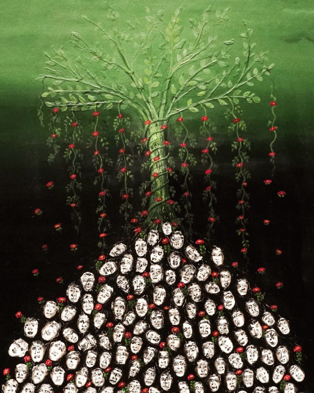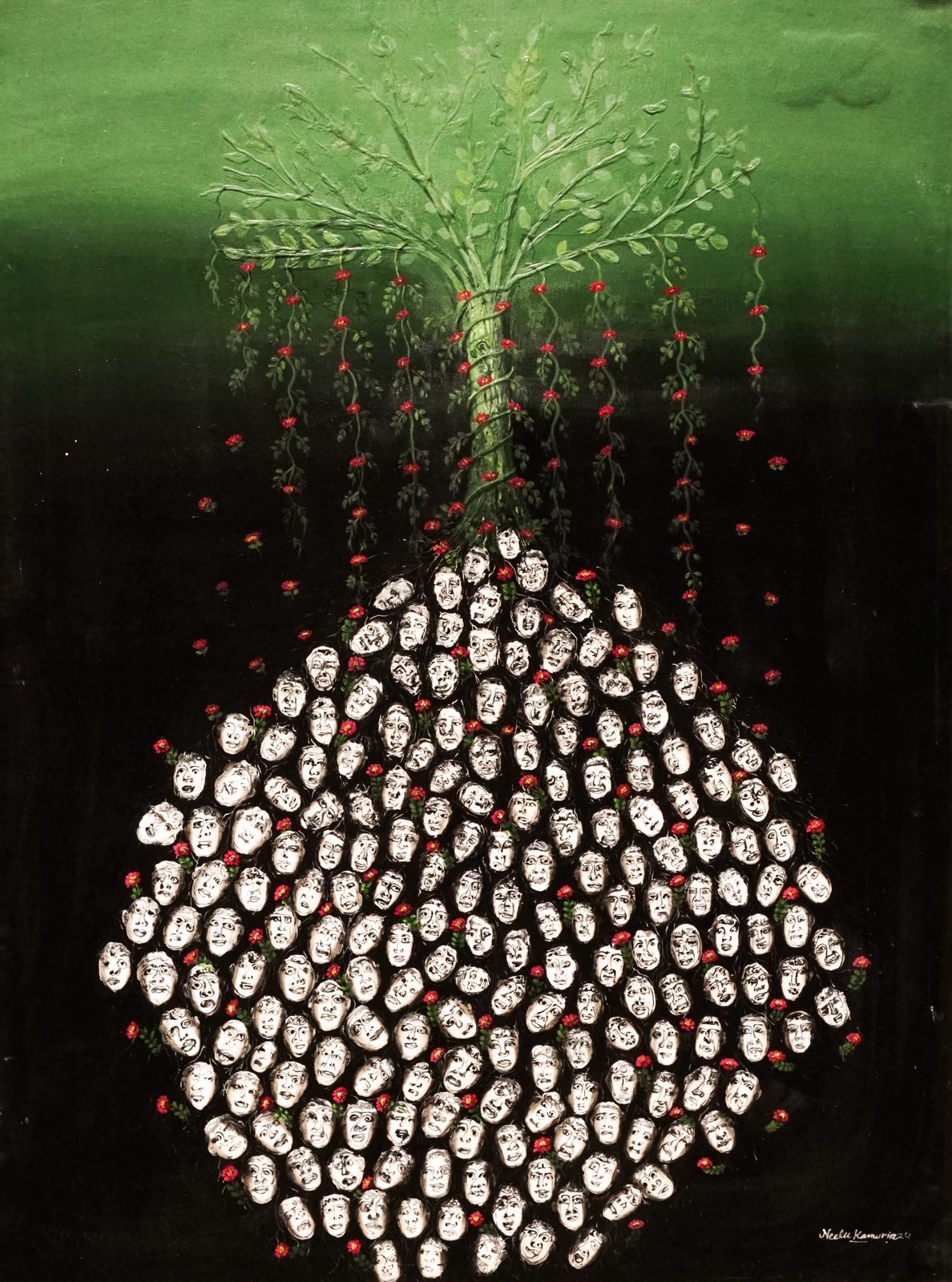 A poetic interplay of life and identity, this painting shows a flourishing tree whose roots are made up of countless human faces. Each face reflects a soul, a story—deeply intertwined with nature. Red blossoms descend like memories or lifelines, grounding the green canopy above in shared human experience and ancestral connection.