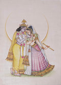 This enchanting miniature painting captures a tender moment between Radha and Krishna. Krishna, with his characteristic blue complexion, gently leans towards Radha, who holds a flute. Both figures are adorned in traditional attire and elaborate jewellery, embodying a sense of divine love and grace. A subtle halo frames them, suggesting their spiritual significance, all rendered with delicate brushstrokes typical of miniature art.