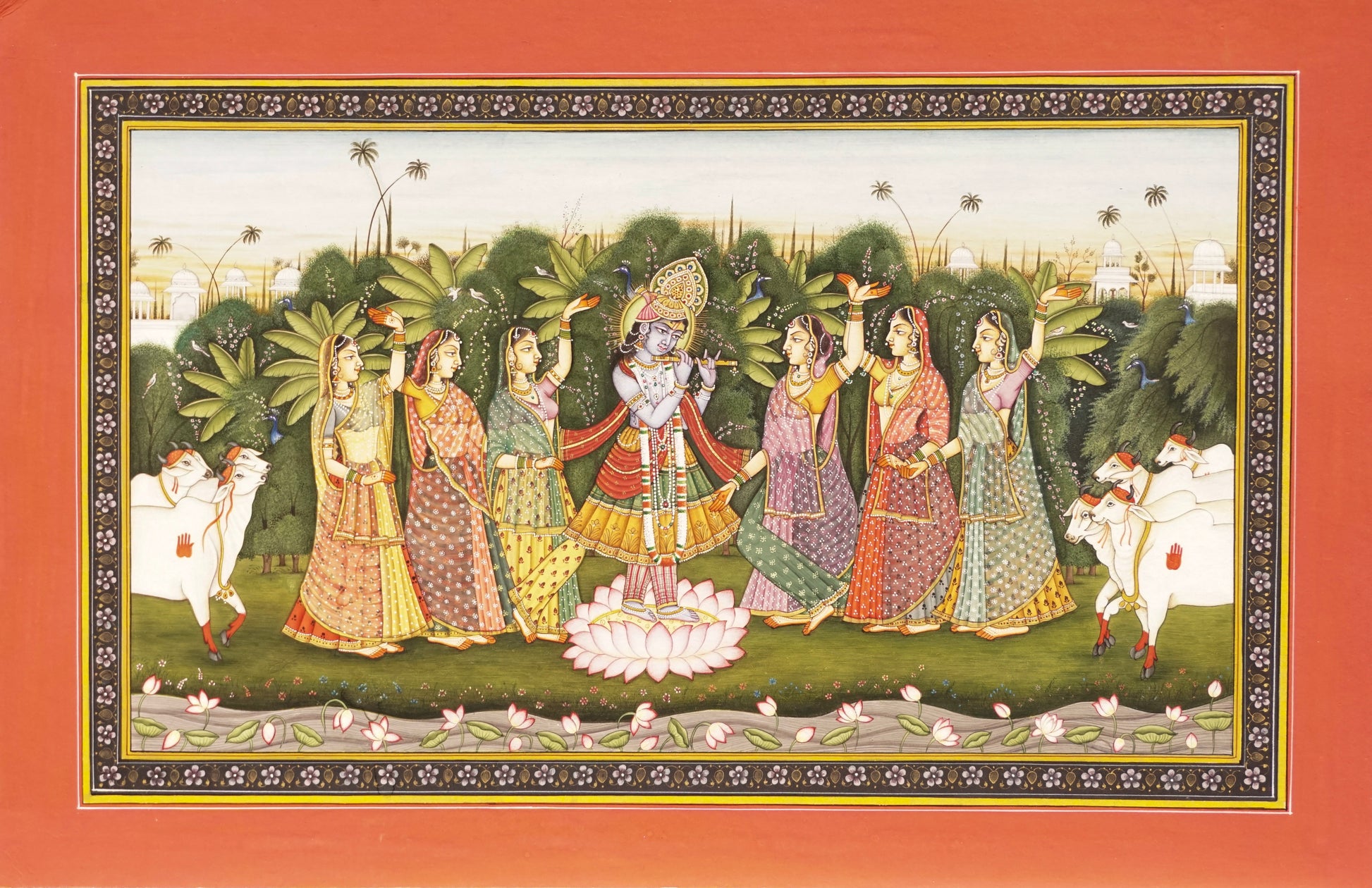 This vibrant miniature art piece depicts Radha and Krishna surrounded by gopis, celebrating amidst a lush, stylised landscape. Krishna stands centrally, adorned with a peacock feather crown, while the gopis are dressed in colourful traditional attire, some holding offerings or musical instruments. The scene is set in a verdant garden with trees and blossoms, and notably, two white cows are visible on either side. The painting is framed by a decorative border and an outer orange frame, characteristic of traditional Indian miniature art.