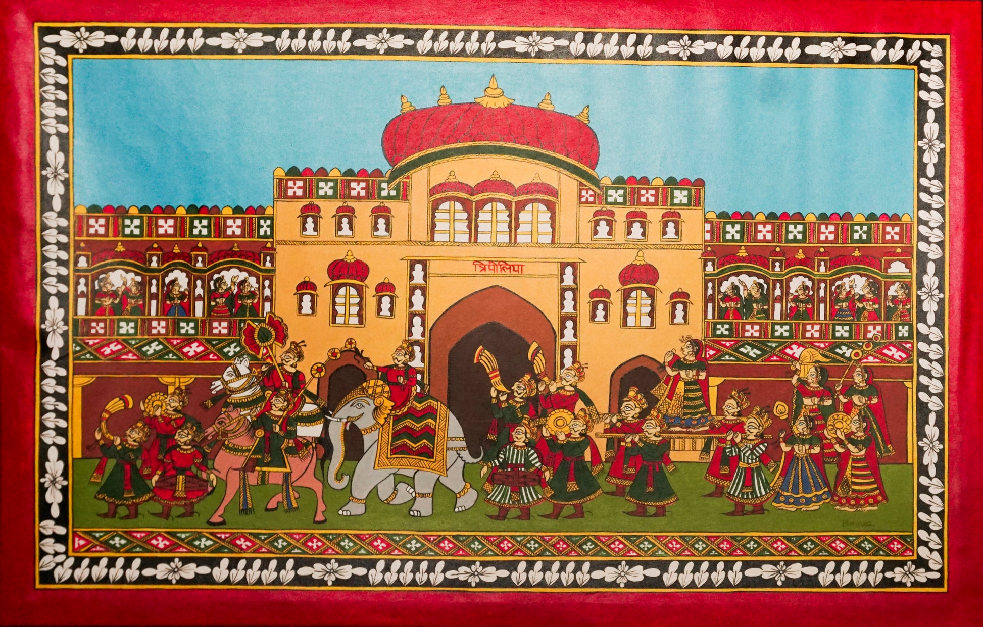 Painted in bold colours of red, green, and gold, this masterpiece reflects the traditional Phad storytelling art of Rajasthan.