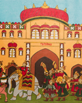 This exquisite Phad painting beautifully illustrates a royal procession in Jaipur, capturing the grandeur of Rajasthan’s Pink City. The artwork portrays a majestic palace façade, with balconies filled with spectators watching nobles, musicians, dancers, and warriors celebrating in unison. Elephants and horses, adorned in traditional finery, lead the vibrant procession, evoking the festive spirit of Jaipur’s royal heritage.